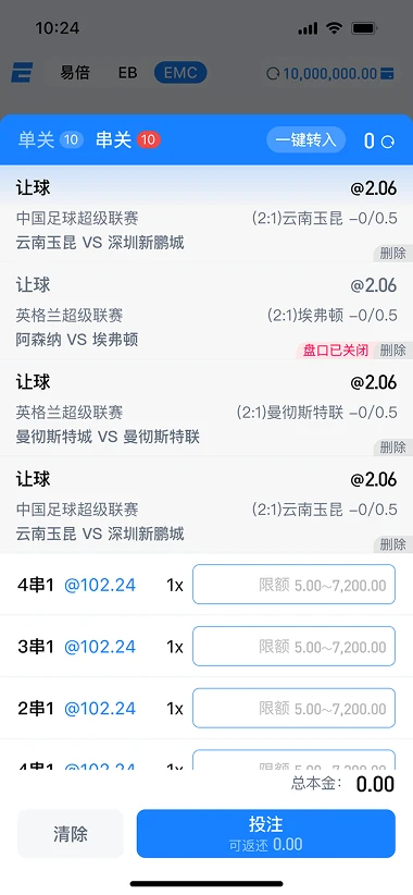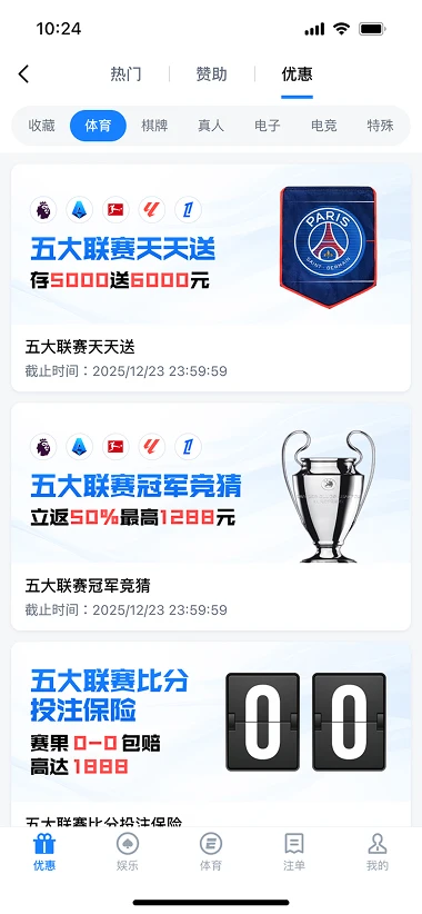 公告: 1、串关保险金 最高88888元 2、五大联赛比分投注保险!赛果0-0包赔 高达1888! 3、五大联赛冠军竞猜 立返50% 最高1288元! 4、EMC霸王餐100%包赔! 5、关于禁止国家队、俱乐部等相关职业成员参与游戏的声明 6、风控提醒 7、【EMC防诈骗】重要提示